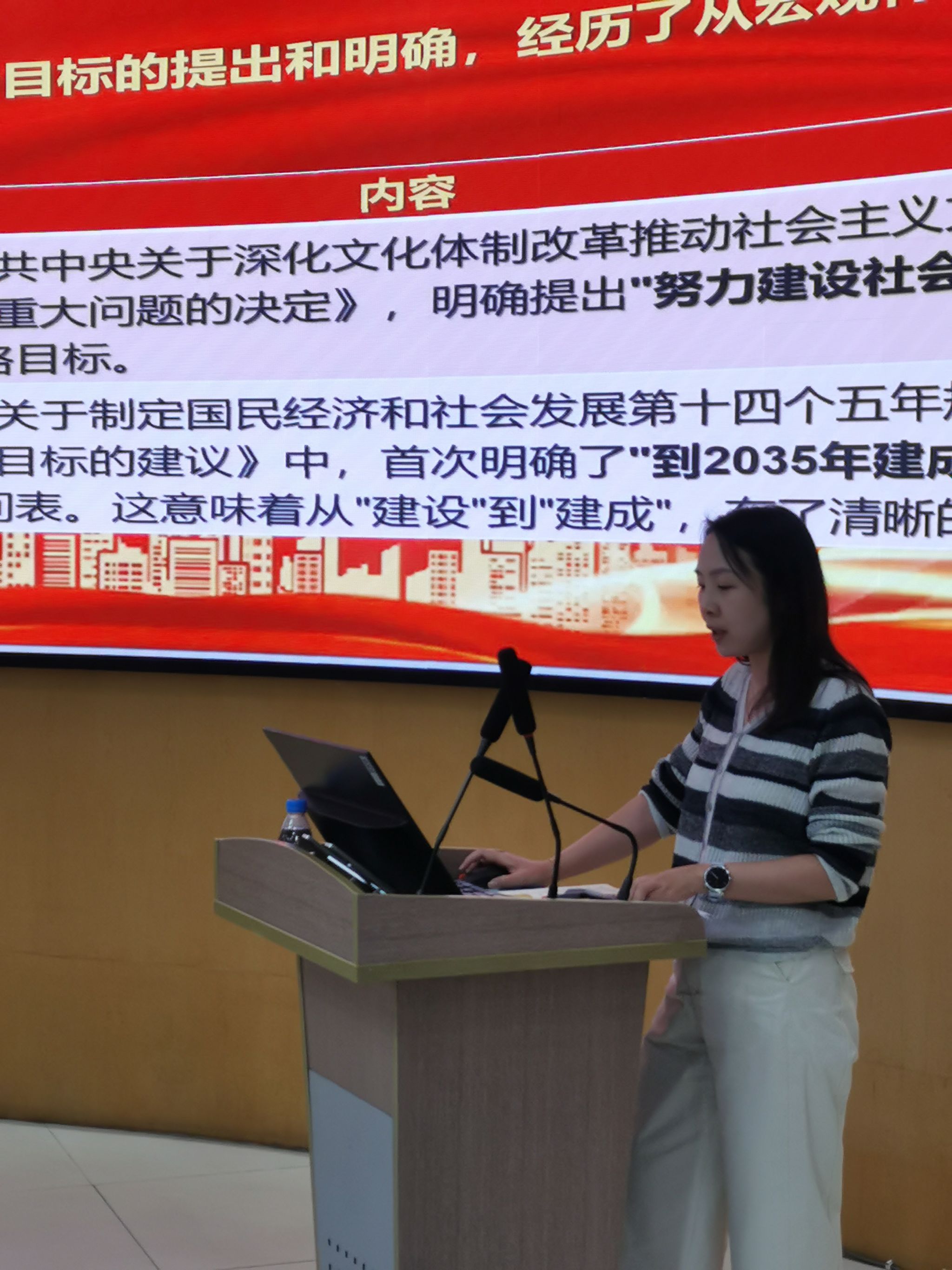 新任支部书记沙黎同志领学 "建设文化强国"这一战略目标的提出和明确的发展过程;详细介绍了"文化强国"的内涵及在国家整体发展进程中的战略地位。沙黎同志结合习近平总书记的重要讲话对参会党员教师提出五项要求:第一,坚定不移走中国特色社会主义文化发展道路;第二,着力激发全民族文化创新创造活力;第三,始终坚持文化建设着眼于人、落脚于人;第四,在创造性转化和创新性发展中赓续中华文脉;第五,不断提升国家文化软实力和中华文化影响力。以此指导我们的日常工作。