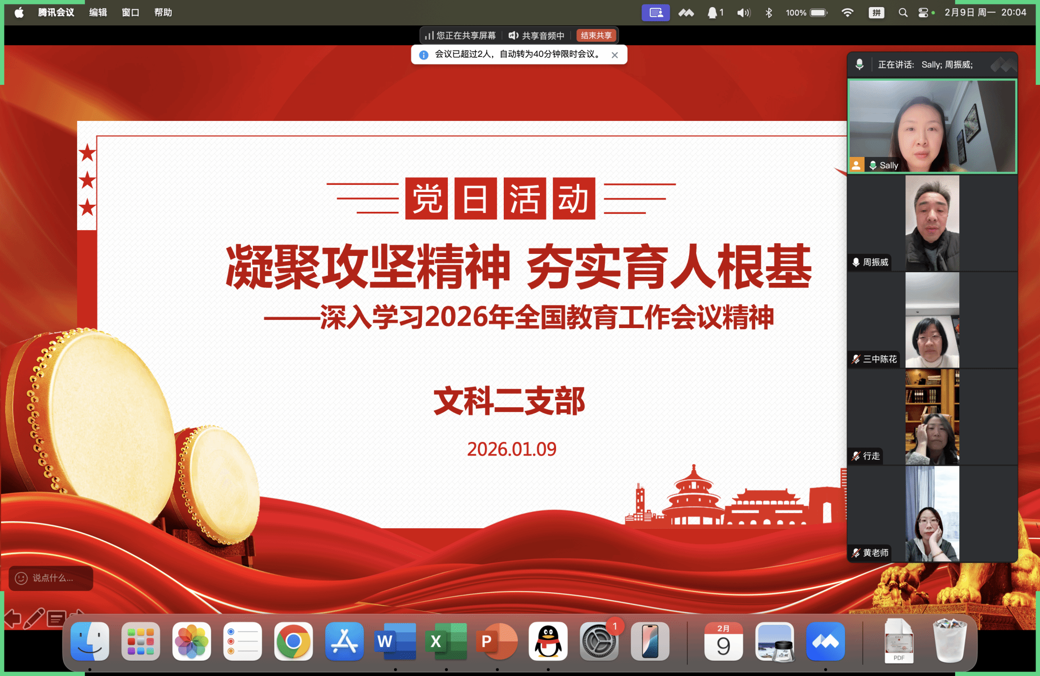 2026年2月9日晚上8点,支部书记沙黎同志主持召开文科二支部二月主题党日活动。本次活动围绕2026年1月8日全国教育工作会议开展理论学习,沙黎同志宣讲了党课《凝聚攻坚精神 夯实育人根基》,介绍了会议召开的背景和重要意义,领学本次会议核心精神与总体要求。